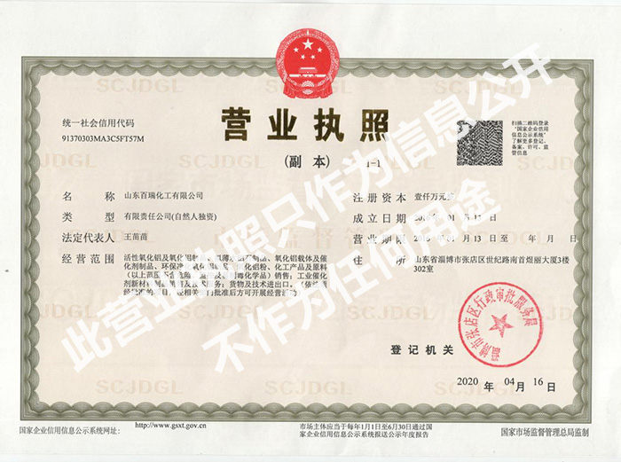山东百瑞化工有限公司是一家致力于氧化铝产品研发、生产和销售的企业。山东百瑞化工有限公司主要生产活性氧化铝、活性氧化铝粉、活性氧化铝微球、拟薄水铝石、吸附剂、催化剂载体、分子筛、氧化铝陶瓷球、高锰酸钾球、氢氧化铝及其他相关产品。产品出口欧美、亚洲各地,深受用户的信赖和良好的评价。